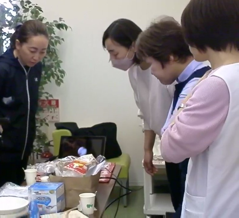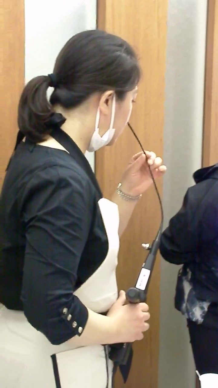 嚥下状態を診る検査に内視鏡を使う検査があります。鼻から内視鏡を入れて、検査食を実際に食べてもらい、嚥下状態をモニターで直接見ます。実際の検査では、写真の様に、これから行う事を説明し、握手をして握力や理解力等を判断し、自然と検査に移る様な配慮を行います。今回は実習なので、当院川嶋Drが自分で自分の鼻に内視鏡を入れて、食べながらの解説。モニターを見ながら、固形物が食塊になって、嚥下されるまでと、嚥下反射が正常に行われた後の喉の状態を確認しました。